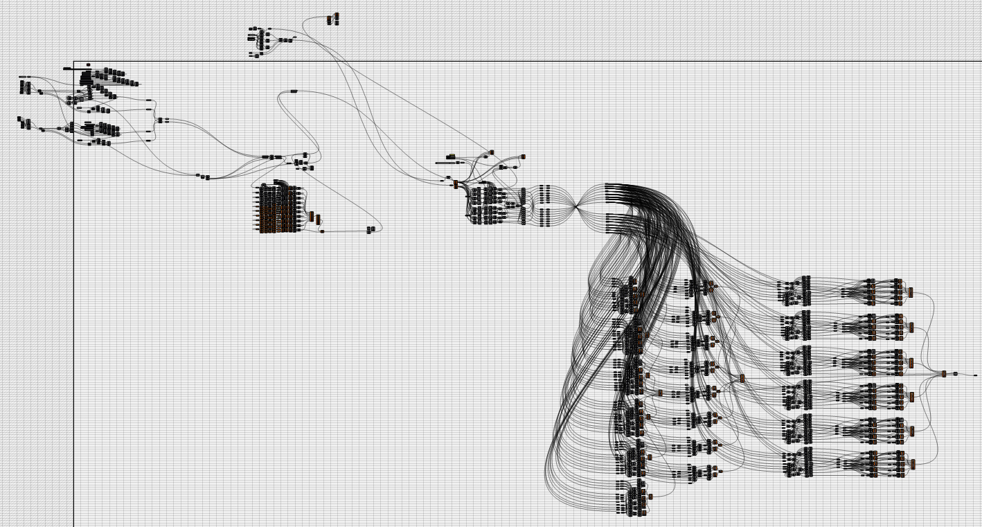 Implementace v Rhinu v Grasshopperu (obrázek lze kliknutím zvětšit):