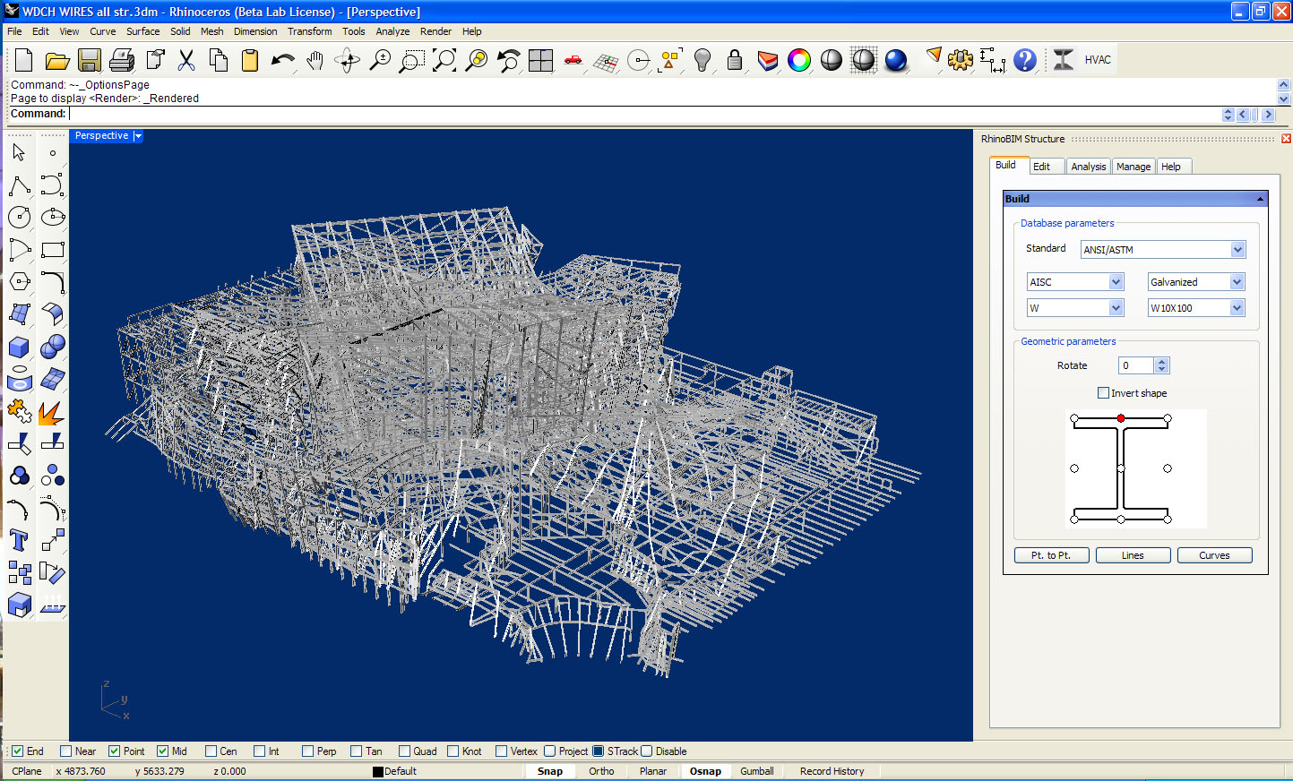 Jak vidíte, dokáže funkce Light Extrusion dramaticky zvýšit výkon Rhina. A co je nejdůležitější, pomocí funkce "vybrat všechny úsečky" v RhinoBIM_Structure bylo vytaženo všech 15 900 nosníků v modelu za pouhé 2 sekundy. Ano, dvě sekundy na levné stanici Dell Latitude D620 a výkon zobrazení byl přitom zcela fantastický.