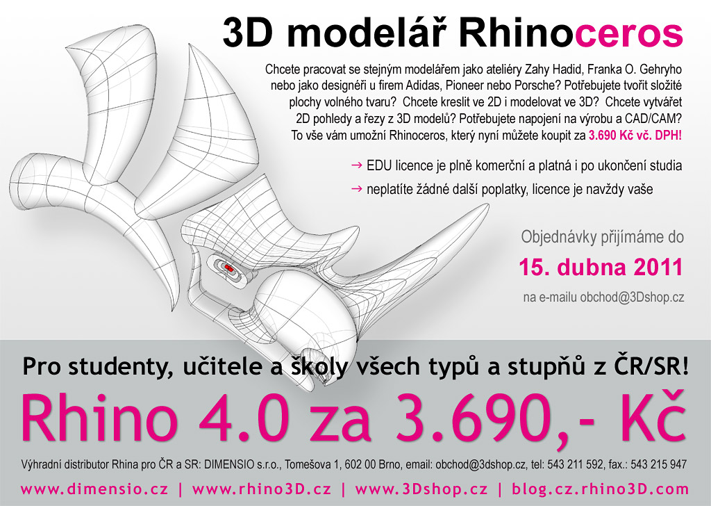 Opět vypisujeme akci pro studenty, učitele a školy, ve které máte možnost získat plně komerční a doživotně platnou EDU licenci Rhina za skvělých 3.690,- Kč včetně DPH. Tentokrát bude mít akce krátké trvání do 15. dubna 2011, proto si pospěšte a objednejte si hned své Rhino, ať vám tato rychlovka neuteče!