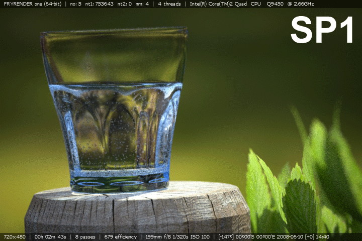 Uvědomte si, že "o 20% rychlejší" znamená, že za stejnou dobu výpočtu se provede o 20% více průchodů než v SP1. Ale díky zlepšení antialiasingu je zrychlení ještě patrnější na začátku renderování (první náhled se ve framebufferu objeví mnohem rychleji).